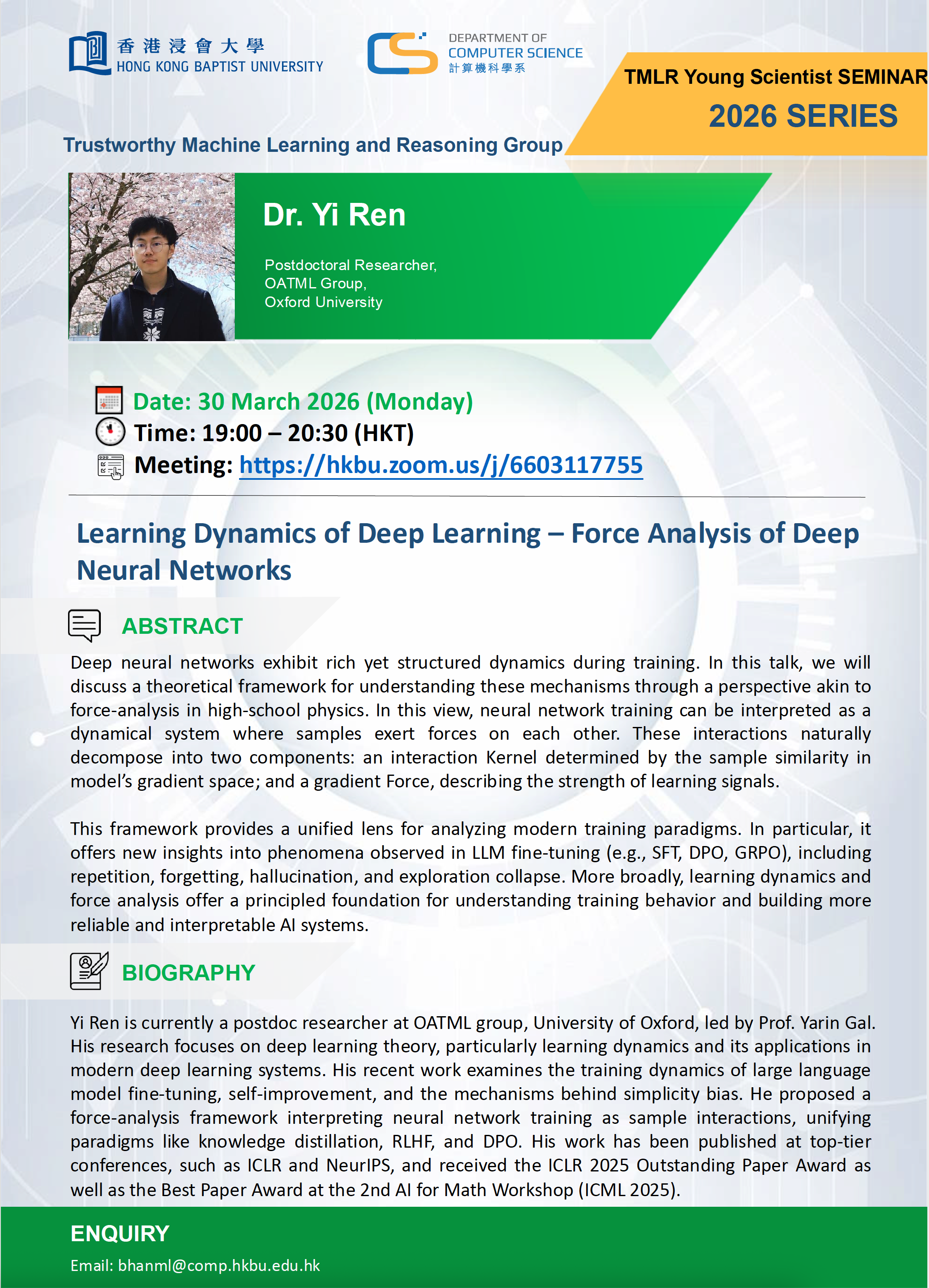 | 30 Mar 2026 | Yi Ren (Oxford University) | Learning Dynamics of Deep Learning - Force Analysis of Deep Neural Networks | View Poster |